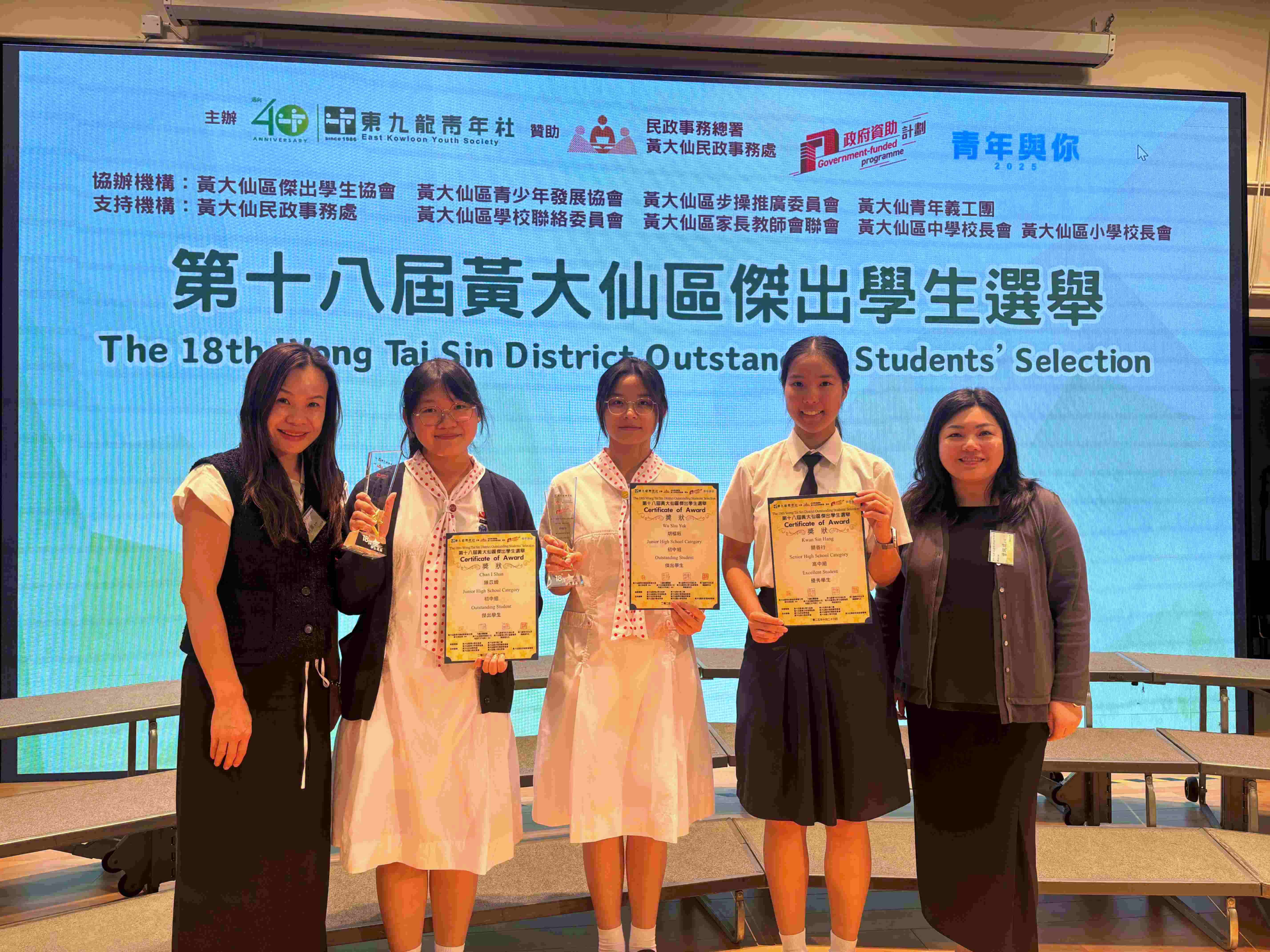 Congratulations to 3A Eva Chan and 3A Angela Wu, for attaining the prestigious Outstanding Student Award (Junior Category) of the 18th Wong Tai Sin District Outstanding Students’ Selection. We also extend our congratulations to 6D Alice Kwan who obtained the Excellent Award (Senior Category). Congratulations!